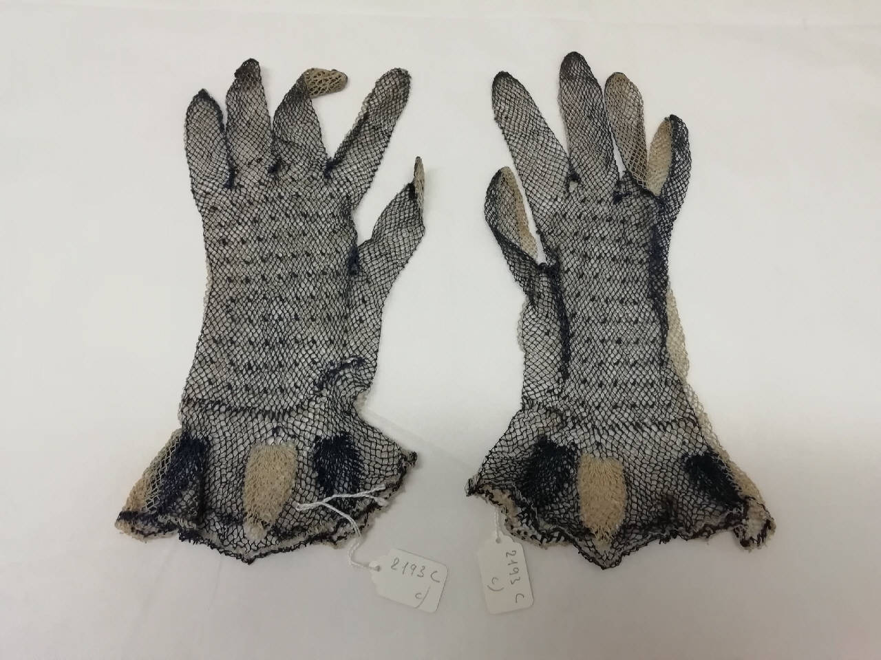 Guanti femminili in rete di cotone lunghi 25 cm. La parte superiore dei guanti è in rete di cotone blu, mentre la parte inferiore è in rete di cotone ecru. Su tutta la circonferenza del polsino, leggermente svasato, vi è un motivo decorativo (forme ovali) realizzato con gli stessi colori dei guanti alternati.