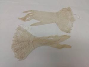 Guanti femminili in rete di cotone ecrù lunghi 30 cm. I polsini sono svasati e presentano una lavorazione a trina.