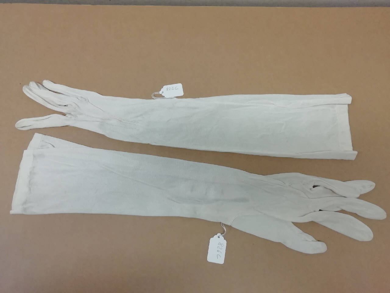 Guanti femminili in seta bianca lunghi 41 cm. All'altezza del polso vi sono 3 piccoli bottoncini tondi madreperlati con chiusura ad asola.