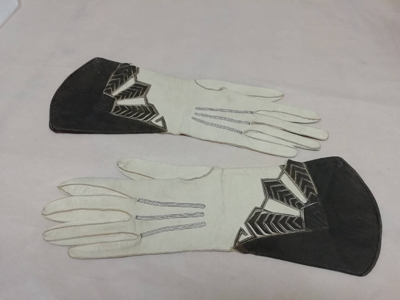 Guanti femminili in pelle di capretto bianca con moschettiere in pelle di capretto scamosciata nera e motivi geometrici decorativi della stessa pelle nera scamosciata. Lunghi 31 cm.