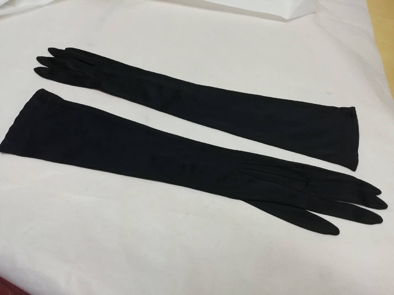 Guanti femminili in seta nera, lunghi 46,5 cm. Presenza all'altezza del polso di 3 bottoncini tondi in plastica nera con chiusura a pressione; la parte è bordata di seta bianca.