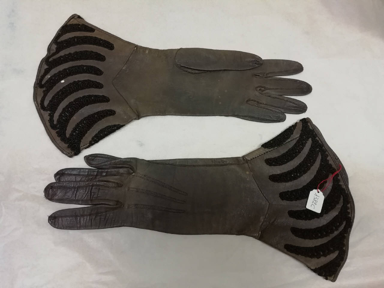 Guanti femminili in pelle di capretto marrone con paramano alla moschettiera con decorazioni di passamaneria, lunghi 34,5 e 35 cm.