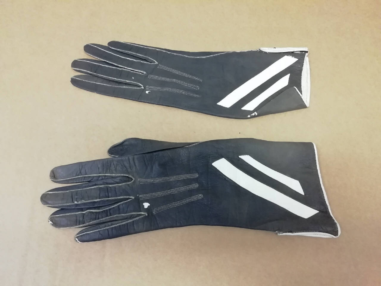 Guanti femminili in pelle di capretto nera con cuciture bianche. Sul dorso vi sono 2 strisce diagonali in pelle di capretto bianca. Piccolo spacco sulla parte esterna dei guanti. Lunghezza 26 cm.