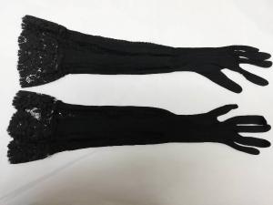 Guanti femminili in pizzo meccanico di colore nero, lunghi 48 e 48,5 cm.