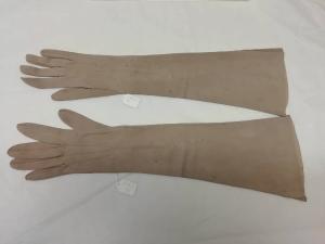 Guanti femminili in pelle di capretto scamosciata color tortora, lunghi 45,5 e 46 cm. All'altezza del polso presenza di 3 bottoncini tondi madreperlati con chiusura ad asola.