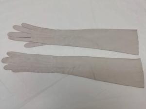 Guanti femminili in pelle di capretto scamosciata color rosa cipria, lunghi 53 cm. All'altezza del polso presenza di 3 bottoncini a forma di perla con chiusura ad asola.