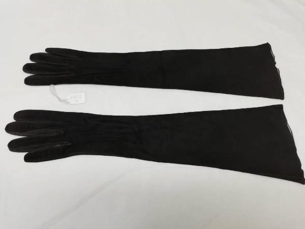 Guanti femminili in pelle di capretto scamosciata marrone scura, lunghi 44 cm.