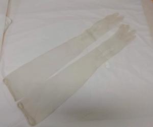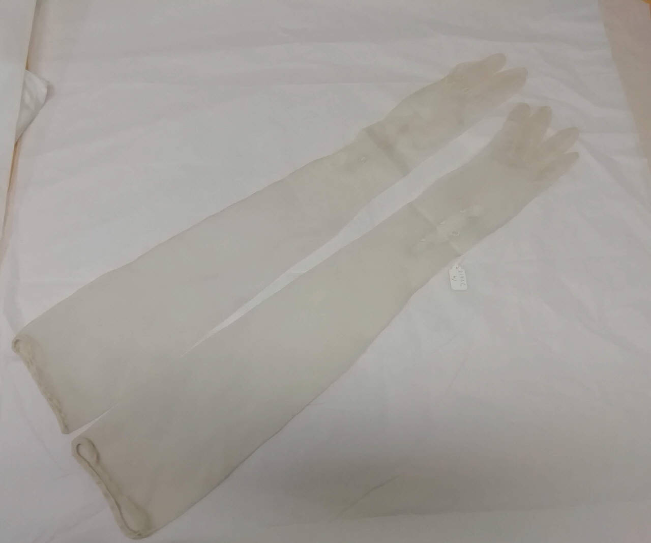 Guanti femminili in organza di seta bianca, lunghi 67 cm. All'altezza del polso presenza di 3 bottoncini tondi madreperlati con chiusura ad asola.