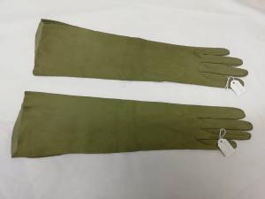 Guanti femminili in pelle di capretto scamosciata verde oliva, lunghi 38 cm.