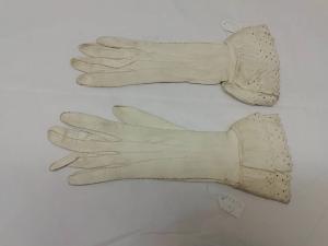 Guanti femminili in pelle di capretto color avorio lunghi 26,5 cm e 27,5 cm. Paramano con due balze traforate dello stesso materiale dei guanti. All'altezza del polso vi è un bottoncino madreperlato con chiusura ad asola; vi è inoltre un leggero spacco sulla parte esterna del paramano.