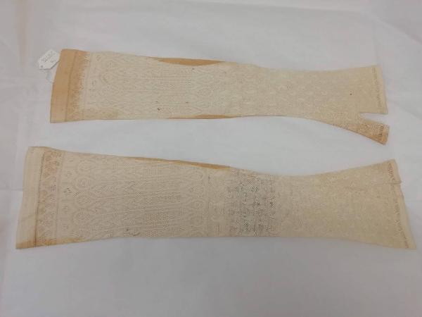 Guanti femminili modello mitaine in maglia meccanica operata di colore bianco, lunghi 41,5 cm. Decorazione con motivi floreali e geometrici.