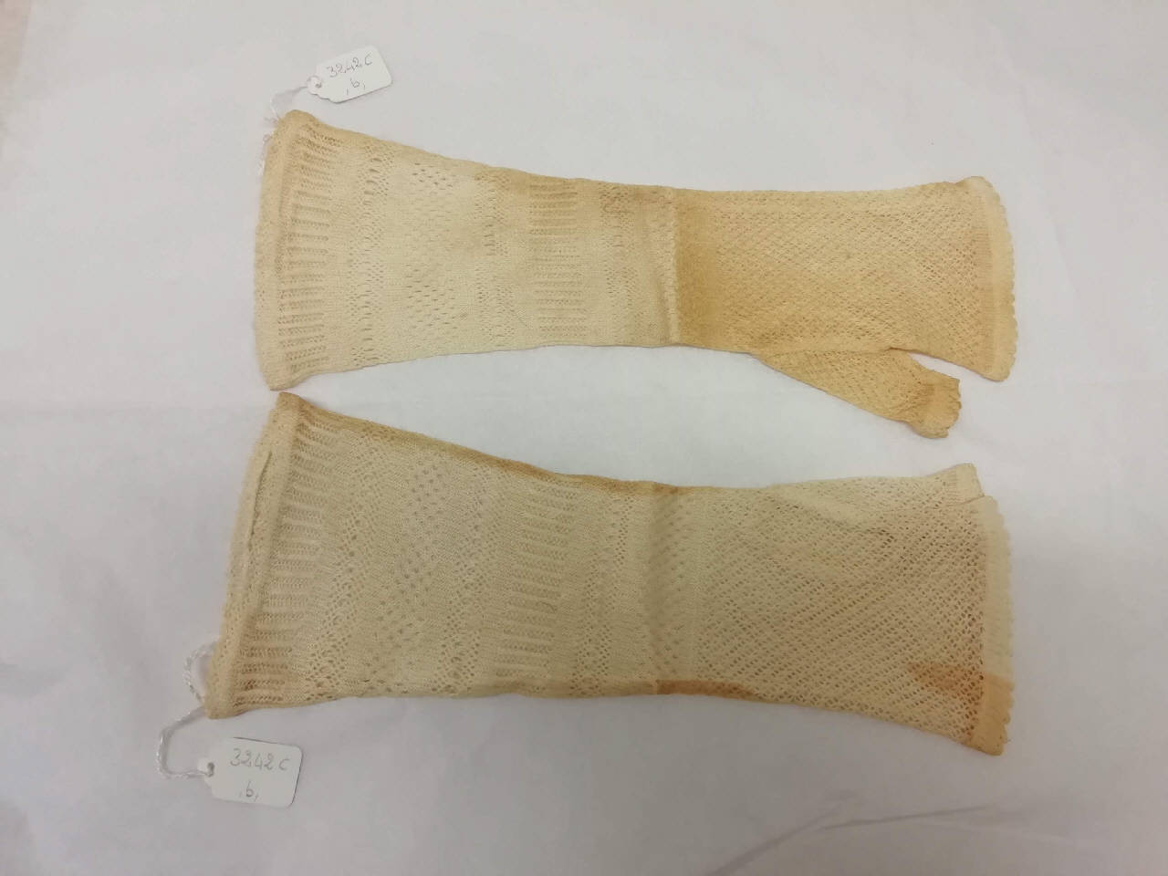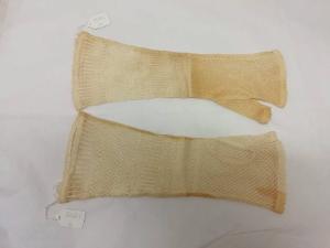 Guanti femminili modello mitaine in maglia meccanica operata di cotone bianco, lunghi 26,5 e 27,5 cm. Motivi decorativi geometrici e a griglia.