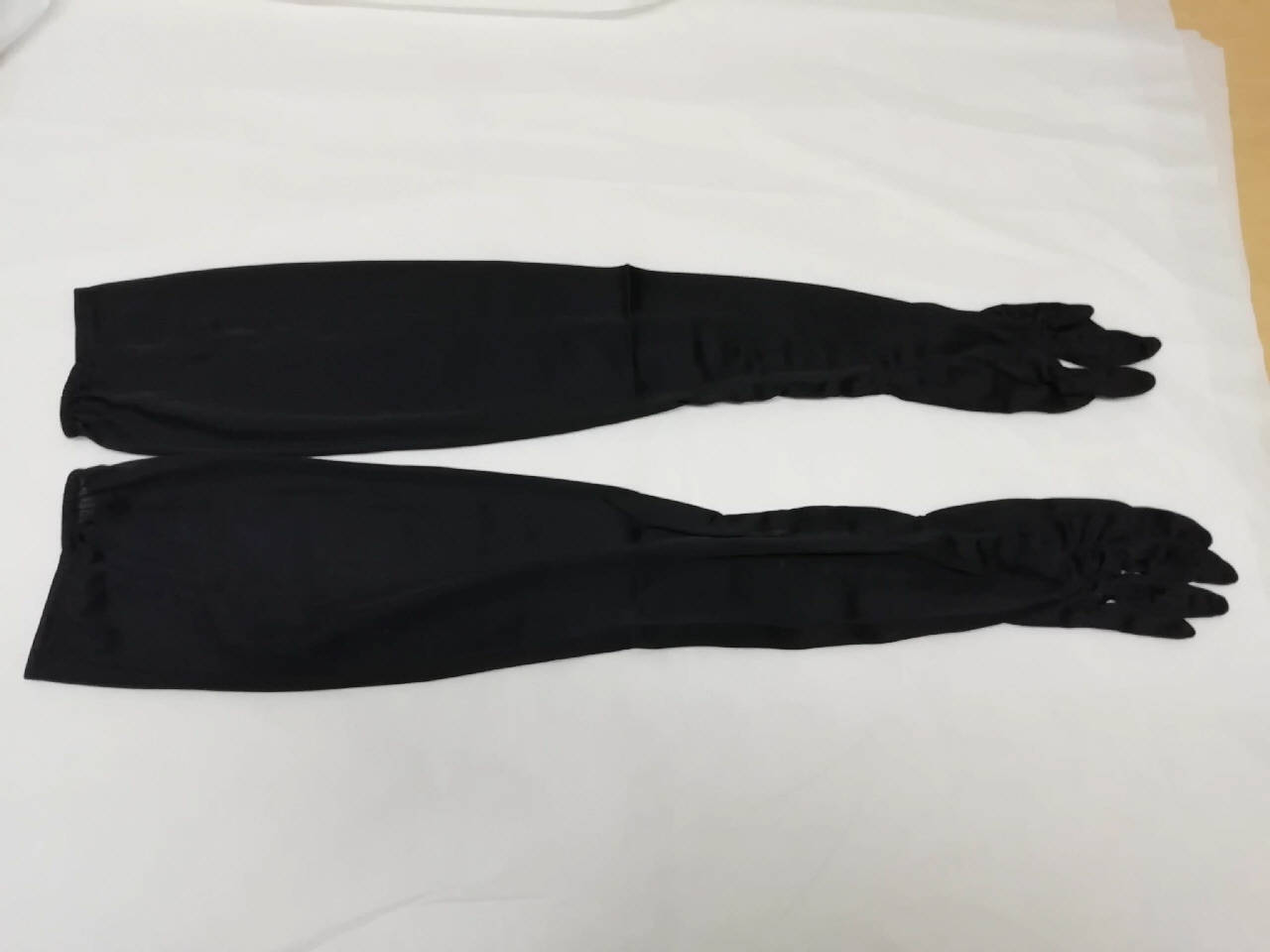 Guanti femminili lunghi 61 cm in nylon nero con inserimento di un elastico sull'orlo. All'altezza del polso vi sono 3 bottoncini metallici con chiusura ad asola.