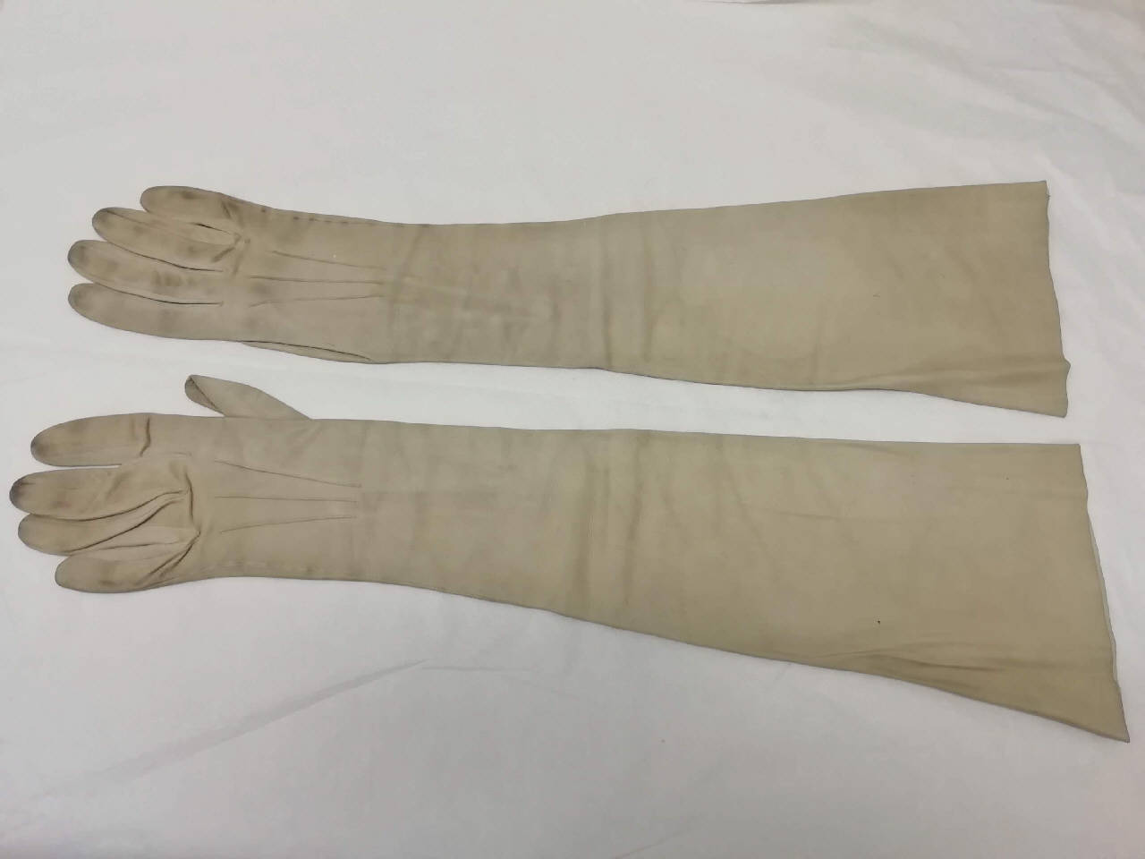 Guanti femminili in pelle di capretto scamosciata color tortora, lunghi 55,5 cm. All'altezza del polso vi sono 3 bottoni a forma di perla leggermente schiacciata con chiusura ad asola.