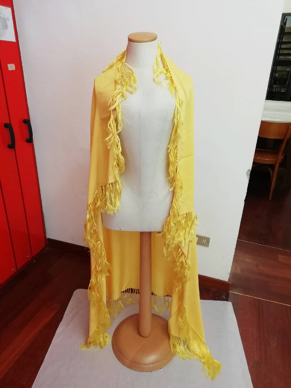Scialle quadrangolare di chiffon di seta gialla. Dagli orli partono frange di seta dello stesso colore.