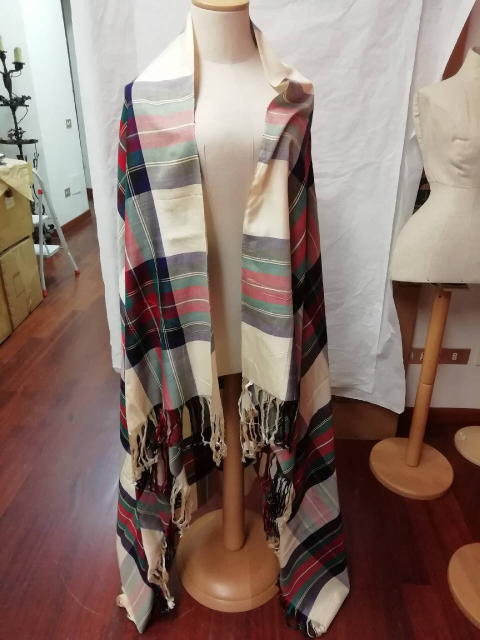 Scialle sfrangiato a quadri scozzesi in rosso, blu e verde in seta.