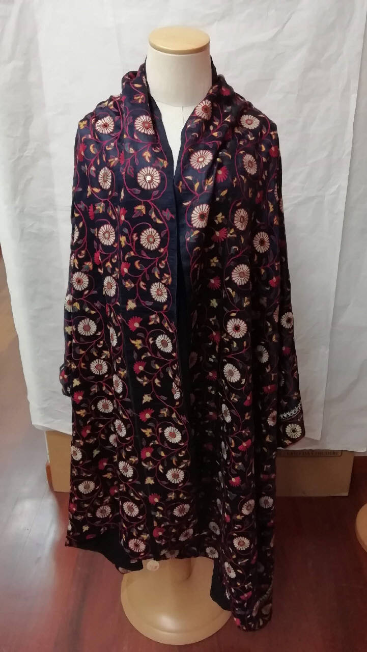 Scialle di seta lucida leggera di color indaco scuro ricamato a fiori polilobati bianchi profilati in rosso con lustrino al centro e rossi con centro giallo, riuniti da tenui rami rossi con fogliette gialle e verdi profilate in rosso. Da un lato bordo con motivo in bianco e fiori tra volute. Fodera in crespo georgette.