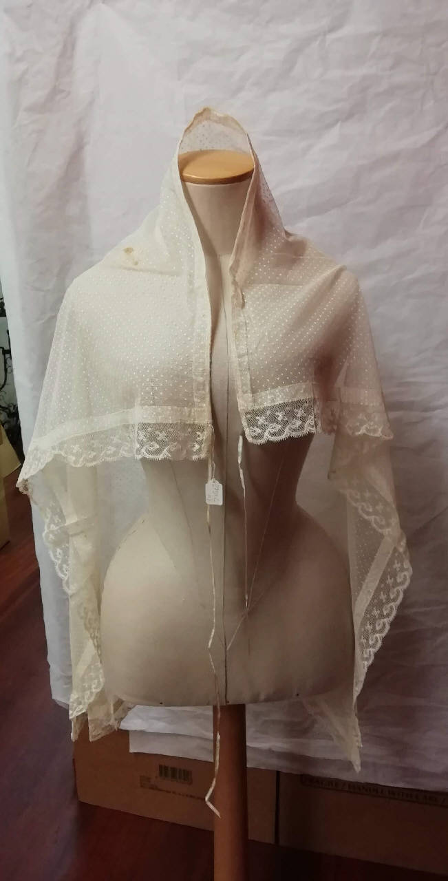 Stola a mantellina in pizzo operato e profilato da pizzo Valenciennes su tre lati. Laccetti frontali.