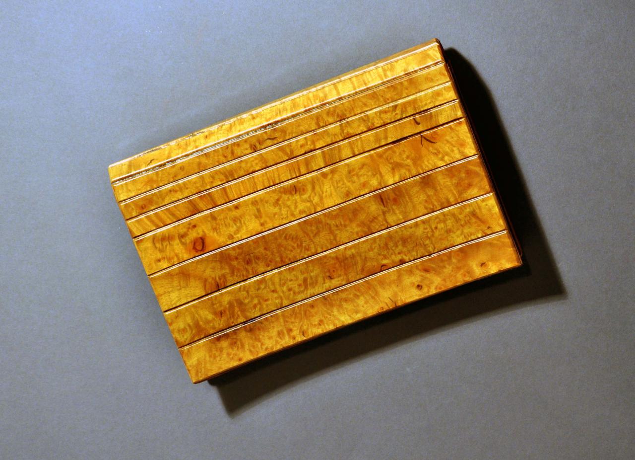 Borsa «a busta» da giorno in liste di radica applicate su tela e su pelle color nocciola. Interno foderato in tessuto crema operato con le scritte «MANGIAMELI MADE IN ITALY» e logo «MMM» alternate; tasca chiusa con zip. La tracolla, in metallo dorato, è fissata internamente a due asole in pelle e può essere inserita nella borsa, che si trasforma così in una borsa «a mano».