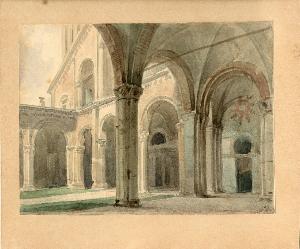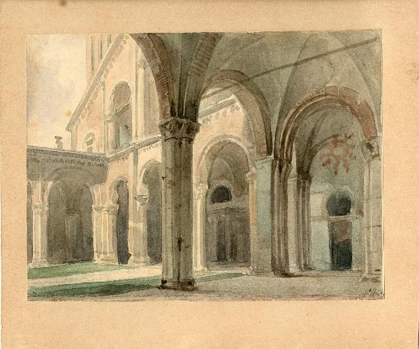Acquarello raffigurante il cortile interno della basilica di Sant'Ambrogio a Milano