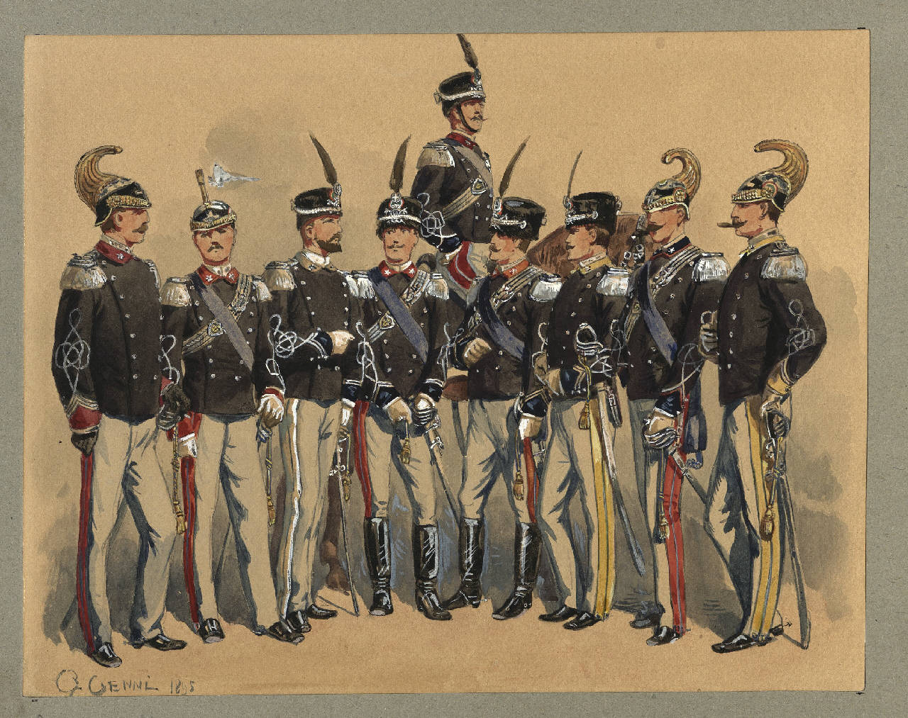 - NOTIZIE STORICO CRITICHE Nel disegno sono raffigurati alcuni ufficiali di cavalleria in gran montura. Da sinistra a destra si riconoscono un capitano di Nizza Cavalleria, un sotto-tenente di Piemonte Cavalleria, un tenente dei Lancieri di Novara, un tenente dei Lancieri di Milano, un sotto-tenente a cavallo dei Lancieri di Aosta, un tenente dei Lancieri di Firenze, un tenente dei Lancieri di Vittorio Emanuele II, un sotto-tenente di Savoia Cavalleria, e un tenente di Genova Cavalleria.