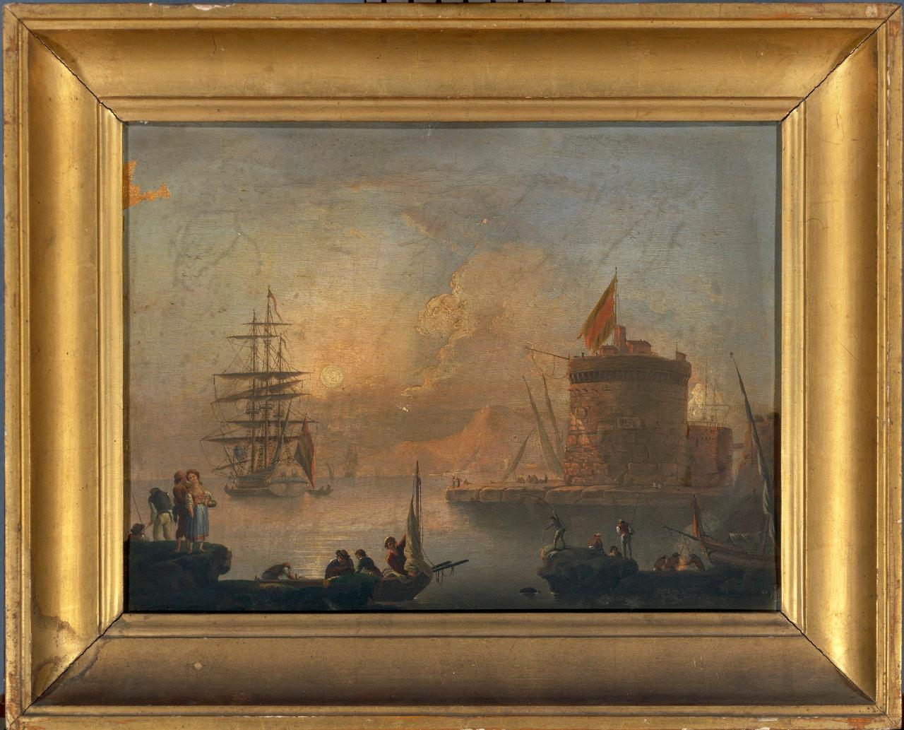 Paesaggio mediterraneo con porto, vascello e figure. marina con porto, barche e figure
