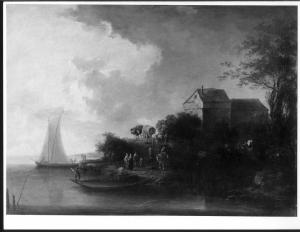 RIVA DI UN LAGO CON BARCHE,CASA,CARRI E FIGURE