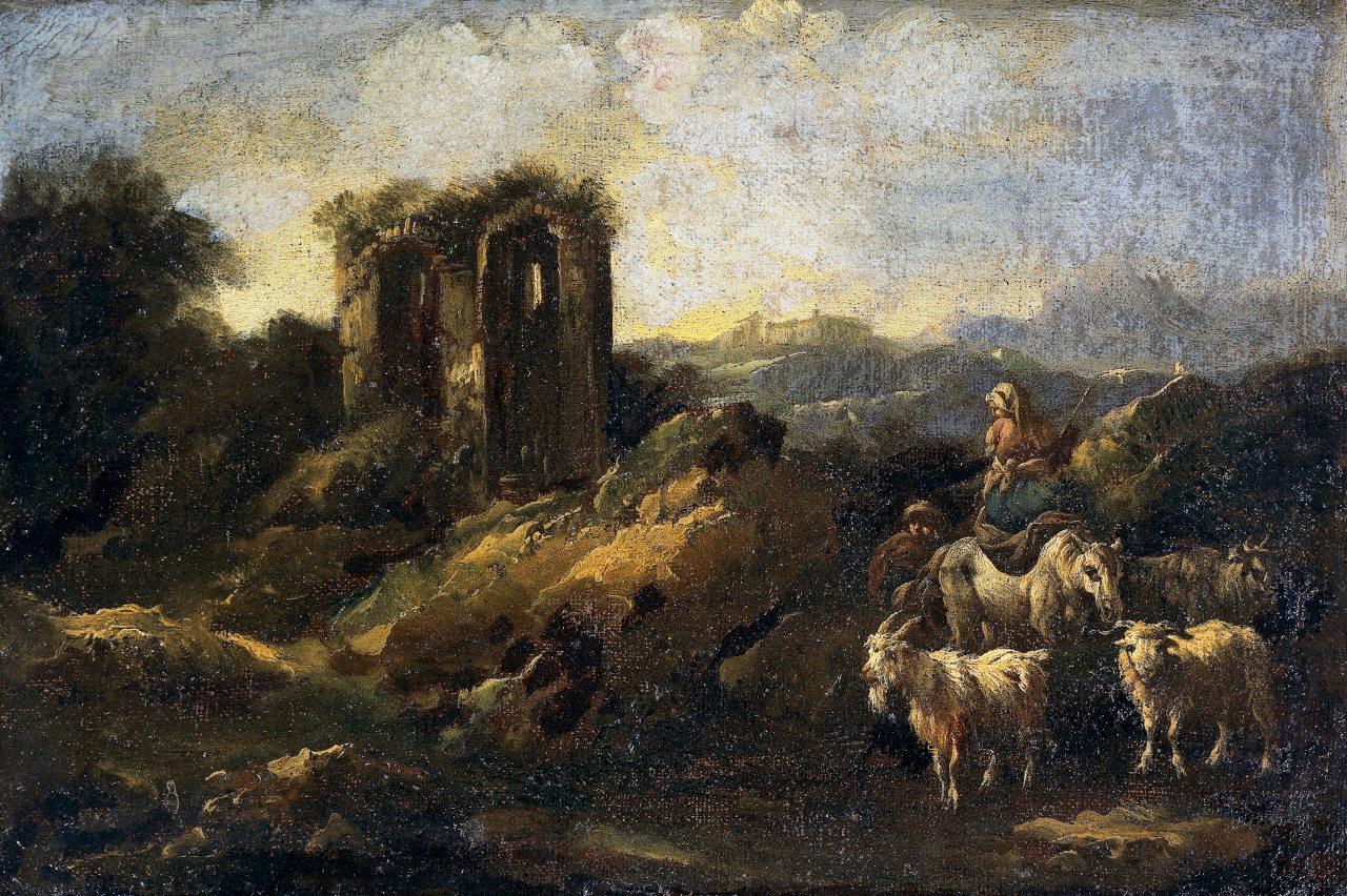 Paesaggio con pastori e rovine. pastori con gregge e rovina architettonica