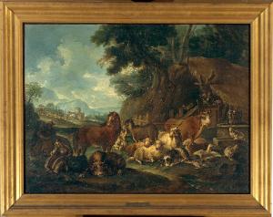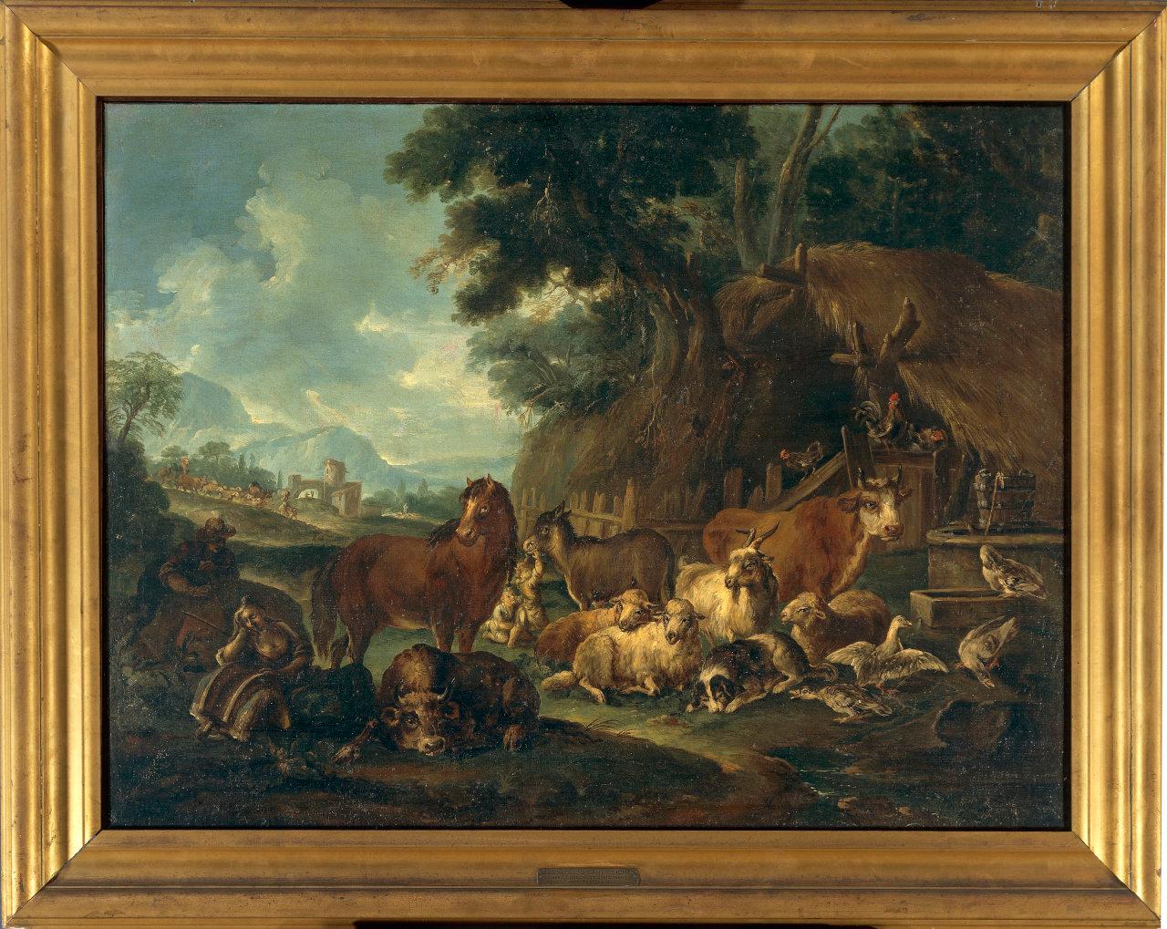 Scena pastorale. pastori con animali accanto ad una capanna