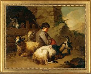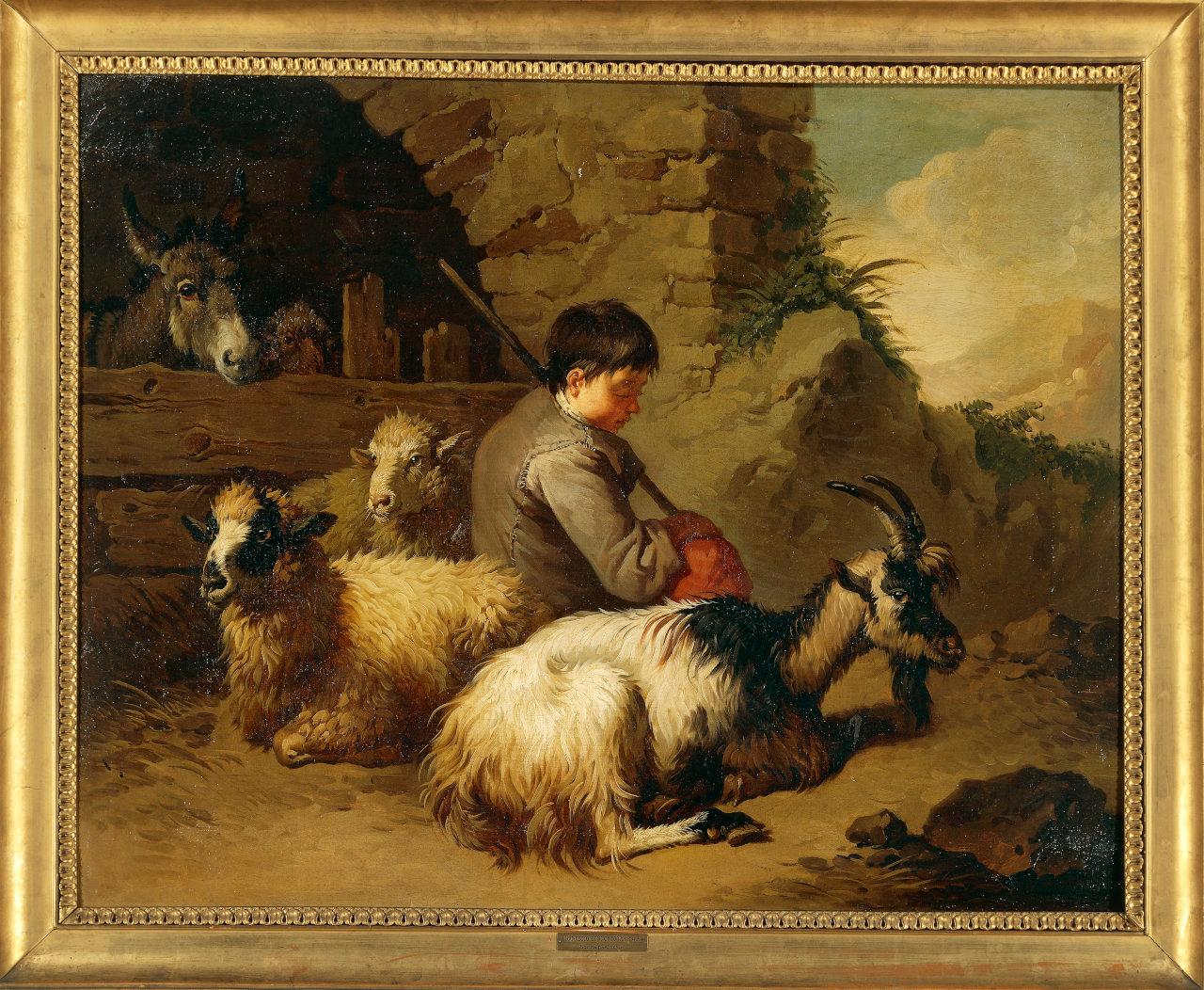 Pastorello seduto, asino, due pecore e una capra in riposo. pastorello seduto con capra e pecore
