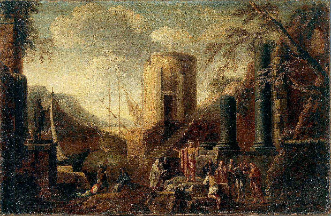 Paesaggio con la predicazione di Sant'Andrea. paesaggio con apostolo in preghiera