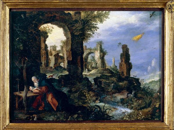 Paesaggio con eremita che legge fra le rovine. paesaggio con rovine ed eremita