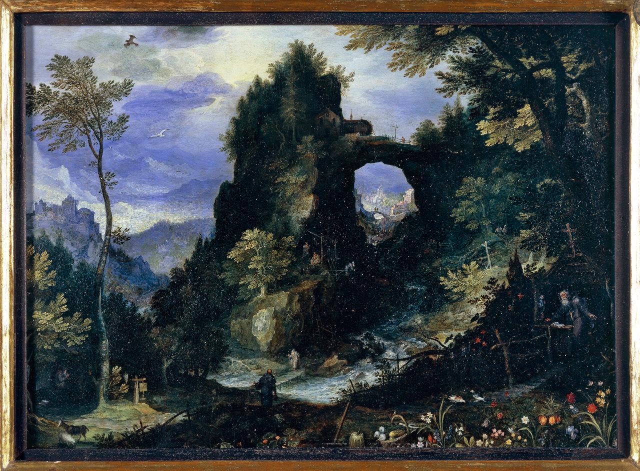 Paesaggio con monaco in preghiera. paesaggio con monaco in preghiera