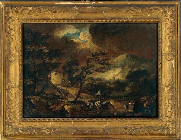 Paesaggio con temporale. fiume con barche e figure sorprese dal temporale