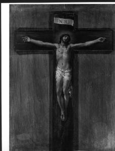 • NOTIZIE STORICO CRITICHE Il dipinto faceva parte della collezione del cardinale Cesare Monti, come documenta l'Inventario del 1638. A quell'epoca si trovava nella stanza da letto invernale del Cardinale ed aveva una cornice in ebano. Per disposizione testamentaria il crocifisso passa a Bartolomeo Fassio, arciprete del collegio di S. Tommaso; questo avviene presumibilmente nel 1650, anno della morte del cardinale. Non è invece documentata la data di ingresso dell'opera in Ambrosiana, dove è citata per la prima volta da Agostino Santagostino (1671, p. 71) nella Biblioteca; non se ne fa invece menzione nell'Inventario manoscritto del 1661. Si ritrova citata poi nell'opera del Bosca (1672, p. 128) e nell'Inventario manoscritto del 1685, quando è collocata nella Galleria delle Pitture, dove è ancora documentata nel 1798. Nel 1830 è invece documentata nella Sala del Cartone di Raffaello (Ms A. 357 Inf., fasc. 30, f. 118). In una guida dell'Ambrosiana del 1860 si dice che il Crocifisso, insieme all'acquasantiera in argento, si trovava sopra il letto del cardinal Federico Borromeo, ma questa notizia sembra poco probabile, appartenendo l'opera alla collezione Monti. \nE' stato dimenticato dalla bibliografia cortonesca fino al catalogo ragionato del 1962 (Briganti 1962, p. 271); qui lo si ritiene opera tarda e probabilmente da mettere in relazione con il disegno per un crocefisso d'avorio promesso al Granduca di Toscana nel 1666 e inviato nel novembre di quell'anno a Firenze. Secondo Bona Castellotti (1980, p. 71) si tratta di una copia tarda. Strette sembrano invece le analogie stilistiche con il Cristo crocifisso dipinto ad affresco nella cappella di Palazzo Barberini a Roma (1631-1632), realizzato in un periodo non lontano dalla data in cui l'opera è sicuramente presente nella collezione Monti (1638), terminus ante quem per la sua esecuzione.