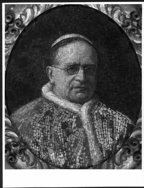 Ritratto ovale inserito in una cornice in legno coeva decorata con grandi foglie. In cima presenta lo stemma del papa: si tratta di uno stemma troncato, nel primo d'oro con l'aquila; nel secondo d'argento a tre palle di rosso disposte due e una (cfr. Stemma di PIo XI, in Enciclopedia dei Papi, III, Roma 2001, p. 739).