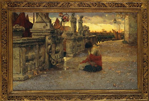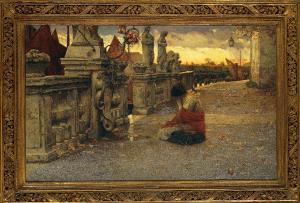Refugium peccatorum. donna accovacciata presso una balaustra