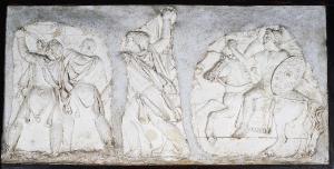 Scene dalla Colonna traiana: Due Daci in assedio, Dace combattente a Tapae, Esploratore romano (copie). imprese di Traiano