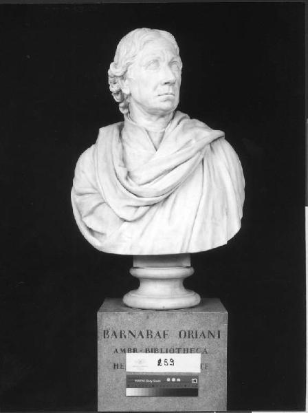 - NOTIZIE STORICO CRITICHE Il busto fa parte di una serie di ritratti eseguiti da Gaetano Monti e presenti in Ambrosiana. Concordemente gli vengono attribuiti, oltre al busto di Barnaba Oriani: quello di Giovanni De Pecis, quello di Maria De Pecis Parravicini e quello del barone Pietro Custodi. Il Veneziani (1860) gli attribuisce anche quello del sacerdote dell'Acqua.