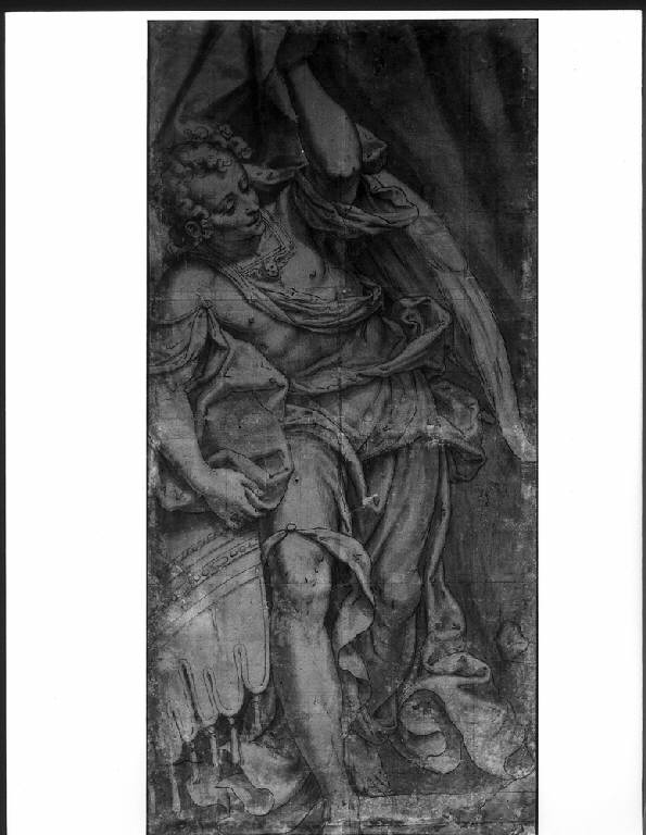 - NOTIZIE STORICO CRITICHE Giulio Bora (1971) cita per la prima volta questi angeli in riferimento agli affreschi sul tramezzo di San Vittore a Meda, scoperti nel 1964 a seguito della rimozione di un quadro del Cerano, occupante la parte centrale della parete divisoria. Si tratta di due angeli reggicortina; i cartoni dell'Ambrosiana sono preparatori per questi affreschi. In questa occasione Giulio Bora attribuisce affreschi e cartoni (di cui non cita la collocazione, dicendo solo di averli trovati in locali della Biblioteca Ambrosiana) a Giulio Campi; inoltre mette in relazione i cartoni con quelli citati a partire dalla donazione di Federico Borromeo (1618) come "Due Angeli nudi disegnati da Bernardino Hanino sopra/la carta nera, larghi un braccio e quattro once, ed alti due et once due l'uno"; in seguito, questi cartoni sono registrati nell'inventario manoscritto del 1685, sempre come di opera di Lanino e poi dal Ratti (1907) come di autore ignoto del secolo XVII. La Jones (1997, p. 270) cita i due cartoni attribuiti dal Borromeo a Lanino e li dice perduti. In effetti, sembra strano poter collegare i due cartoni preparatori per gli affreschi di Meda, con quelli registrati nella donazione del 1618; infatti qui il Borromeo dice che il supporto è carta preparata nera e che i due angeli sono nudi. I due cartoni in questione invece raffigurano due angeli vestiti e la carta utilizzata non è nera. In una comunicazione orale del 1980 al Nurchi, Giulio Bora attribuisce invece cartoni e affreschi non più a Giulio Campi bensì ad Aurelio Luini, che sappiamo attivo in S. Vittore a Meda. Più recentemente Francesco Frangi cita gli affreschi con i due angeli attualmente conservati presso la Villa Antona Traversi e i cartoni preparatori dell'Ambrosiana attribuendoli ad Aurelio Luini. L'artsita viene chiamato per la seconda volta in San Vitttore a Meda all'inizio degli anni '70 del XVII secolo, in concomitanza con la presenza nella chiesa di Giulio Campi.