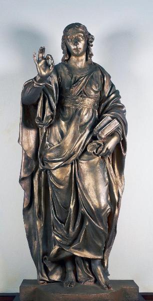 - NOTIZIE STORICO CRITICHE Le sette statue raffiguranti le Arti Liberali vennero commissionate a Dionigi Bussola il 17 maggio 1670, anno in cui fu chiamato presso l'Accademia Ambrosiana come professore di scultura. La loro stima fu eseguita nel 1673. Si trovavano inizialmente all'interno di nicchie nei lati meridionale e settentrionale (Latuada 1738, p. 105) del cortile porticato che nel 1823 venne coperto per essere provvisoriamente utilizzato come Sala di Lettura, in attesa della realizzazione della nuova sala, l'attuale Sala Pio XI, completata nel 1923. Nel 1836 furono collocate sulla terrazza davanti al nuovo ingresso; da qui furono spostate nel 1923, per essere ricollocate nella nuova sala di lettura. In origine le otto statue erano poste su piedistalli in pietra d'Angera, donati dal conte Antonio Borromeo; erano diversi tra loro ed ornati da drappi e festoni; da alcune raffigurazioni (L'Ambrosiana 1923) sembra di distinguere anche le iscrizioni che identificavano le singole allegorie. Con il trasferimento nell'attuale Sala di lettura, l'architetto Annoni sostituì i piedistalli originali con altri in legno e collocò le statue davanti a colonne di marmo tigrato. In cima erano incisi i nomi delle singole Scienze, eliminati con il successivo restauro (1990-1997) della Sala di lettura. È quindi oggi meno facile identificare le diverse allegorie. Le otto statue sono in terracotta; nel 1747 il doratore Caccia fu incaricato di dipingerli con una vernice bianca con finimenti dorati. Nel 1923 l'architetto Annoni le fece ricoprire di una lamina dorata. Nel corso di un successivo intervento, avvenuto nel 1965-66 ad opera dell'architetto Luigi Caccia Dominioni, le statue furono rivestite di uno strato di idropittura di un colore simile a quello della terracotta, nella volontà di riportarle ad una cromia simile a quella originale. Nel corso dell'ultimo intervento (1992-93) questa ridipintura è stata eliminata, mentre si è deciso di mantenere la doratura dell'intervento dell'Annoni. Dal punto di vista stilistico, la critica ritiene che le otto statue sino statue realizzate all'interno dell'attività accademica del Bussola, e probabilmente come dimostrazione didattica per gli allievi. Questo spiegherebbe il livello qualitativo non eccelso delle opere e la minore dimestichezza da parte dell'artista nella lavorazione della terracotta (a detta del restauratore è in alcuni punti malcotta o addirittura cruda; vi sono inoltre parti bruciate e cavità).
