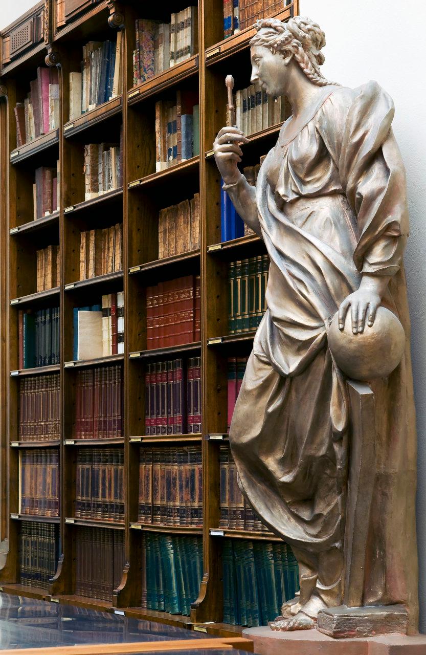 - NOTIZIE STORICO CRITICHE Le sette statue raffiguranti le Arti Liberali vennero commissionate a Dionigi Bussola il 17 maggio 1670, anno in cui fu chiamato presso l'Accademia Ambrosiana come professore di scultura. La loro stima fu eseguita nel 1673. Si trovavano inizialmente all'interno di nicchie nei lati meridionale e settentrionale (Latuada 1738, p. 105) del cortile porticato che nel 1823 venne coperto per essere provvisoriamente utilizzato come Sala di Lettura, in attesa della realizzazione della nuova sala, l'attuale Sala Pio XI, completata nel 1923. Nel 1836 furono collocate sulla terrazza davanti al nuovo ingresso; da qui furono spostate nel 1923, per essere ricollocate nella nuova sala di lettura. In origine le otto statue erano poste su piedistalli in pietra d'Angera, donati dal conte Antonio Borromeo; erano diversi tra loro ed ornati da drappi e festoni; da alcune raffigurazioni (L'Ambrosiana 1923) sembra di distinguere anche le iscrizioni che identificavano le singole allegorie. Con il trasferimento nell'attuale Sala di lettura, l'architetto Annoni sostituì i piedistalli originali con altri in legno e collocò le statue davanti a colonne di marmo tigrato. In cima erano incisi i nomi delle singole Scienze, eliminati con il successivo restauro (1990-1997) della Sala di lettura. È quindi oggi meno facile identificare le diverse allegorie. Le otto statue sono in terracotta; nel 1747 il doratore Caccia fu incaricato di dipingerli con una vernice bianca con finimenti dorati. Nel 1923 l'architetto Annoni le fece ricoprire di una lamina dorata. Nel corso di un successivo intervento, avvenuto nel 1965-66 ad opera dell'architetto Luigi Caccia Dominioni, le statue furono rivestite di uno strato di idropittura di un colore simile a quello della terracotta, nella volontà di riportarle ad una cromia simile a quella originale. Nel corso dell'ultimo intervento (1992-93) questa ridipintura è stata eliminata, mentre si è deciso di mantenere la doratura dell'intervento dell'Annoni. Dal punto di vista stilistico, la critica ritiene che le otto statue sino statue realizzate all'interno dell'attività accademica del Bussola, e probabilmente come dimostrazione didattica per gli allievi. Questo spiegherebbe il livello qualitativo non eccelso delle opere e la minore dimestichezza da parte dell'artista nella lavorazione della terracotta (a detta del restauratore è in alcuni punti malcotta o addirittura cruda; vi sono inoltre parti bruciate e cavità).