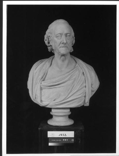 Busto in gesso su basamento circolare, a sua volta appoggiato su un basamento ligneo