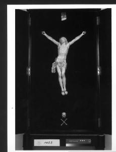 Crocifisso inserito in una teca nera con decorazioni dorate, rivestita internamente di velluto color porpora. La teca è sostenuta da quattro piedi con decorazioni geometrico-floreali dorate e coronata da un fastigio a volute.
