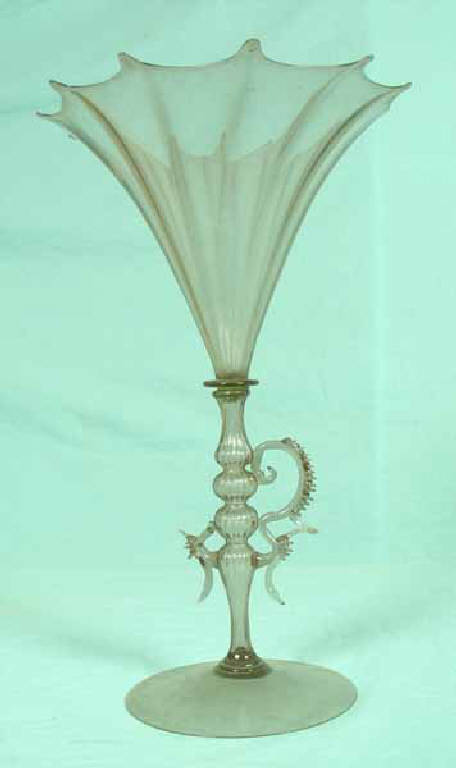- NOTIZIE STORICO CRITICHE Il calice appartiene alla produzione muranese degli ultimi decenni dell'Ottocento per il colore e la qualità del vetro oltrechè per le sue caratteristiche stilistiche. Si ispira ad originali del Seicento. \nCalici con il motivo dell'orlo a punte sono diffusi nella produzione veneziana ottocentesca come documentato da diversi pezzi conservati in collezioni pubbliche. Il più noto è il calice con bolla schiacciata al centro dello stelo, eseguito da Giuseppe Barovier, che si ispirò ai disegni dei vetri barocchi presenti nel Libro del Serenissimo Signore Principe Luigi d'Este della prima metà del XVII secolo. Il volume fu riprodotto nel 1871 per la biblioteca del Museo Vetrario, per essere utilizzato come fonte di modelli antichi dai vetrai veneziani (BAROVIER MENTASTI 1982, p.114, p.202, p.217, p.222).\nIl confronto più stringente è con un disegno di un catalogo di vendita della vetreria M.Q.Testolini, databile al 1890 circa che riproduce un calice identico al nostro pezzo (M. Q. Testolini s. d., n.157).\nAltri pezzi simili coevi sono conservati nelle Kunstsammlungen der Veste Coburg (THEUERKAUFF LIEDERWALD 1994, pp.360-361, nn.368-369).