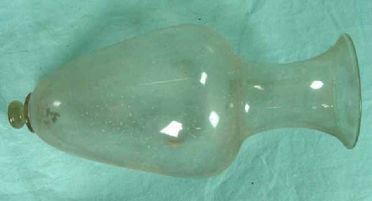 - NOTIZIE STORICO CRITICHE Il pezzo, appartenente alla produzione storicista muranese dell'Ottocento, si ispira agli originali veneziani del Cinquecento, dai quali riprende la forma generale variandola e rendendola meno bombata. Uno di questi pezzi antichi è conservato nel British Museum di Londra ed è inciso a punta di diamante (BAROVIER MENTASTI 1982, p.102, fig.90). \nUn vaso di forma molto simile al nostro compare tra i modelli della Compagnia Venezia Murano, riprodotti in una xilografia del volume di R.W.Edis, Decoration and furniture of Townhouses, pubblicato a Londra nel 1881 (I colori¿ 1999, p.200). Due vasi analoghi, in vetro incolore integri, con corto stelo, nodo costolato e base a disco, sono conservati: uno, acquistato dalla vetreria Salviati nel 1875, nei Staatliche Museen di Berlino (Glas¿1977, n. 55) e l'altro nella Galleria Nazionale d'Arte Antica di Palazzo Barberini, proveniente dal ex Museo Artistico Industriale di Roma (BAROVIER MENTASTI, ZACCAGNINI 2001, p.38). Una variante al modello incolore, fu realizzata dalla Salviati, agli inizi del XX secolo, in vetro lattimo, incamiciato nel vetro rosso, con lo stelo identico al nostro pezzo, ed è oggi conservata nella collezione della Stanford University (OSBORNE 2002, p.120, n.128).