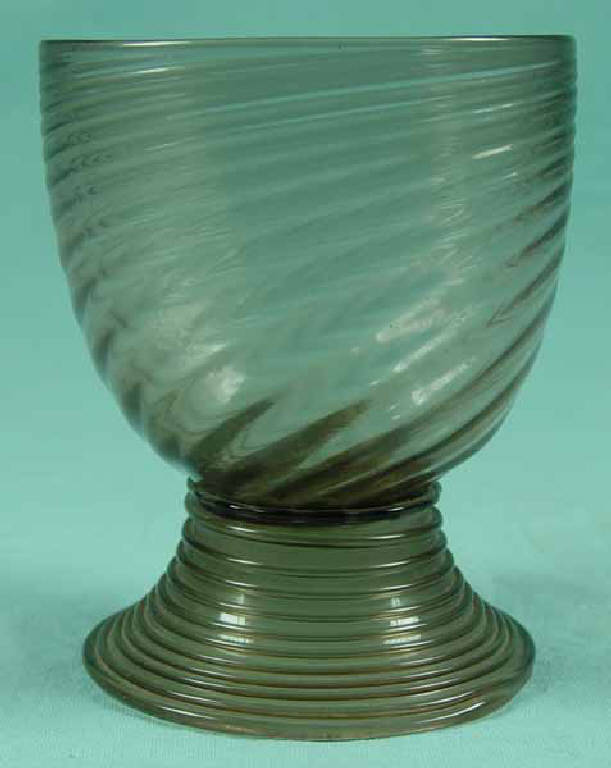 Calice a coppa profonda percorsa da costolature a rigadin retorto (ad andamento spiraliforme). Piede troncoconico decorato da fili vitrei applicati ad andamento circolare. Segno del pontello.