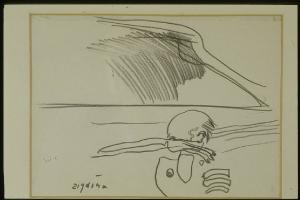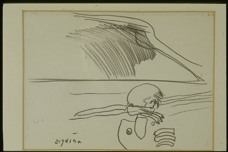 - NOTIZIE STORICO CRITICHE L'atteggiamento della figura in primo piano, con la mano che copre gli occhi, è lo stesso che troviamo spesso raffigurato nella serie di disegni che ha per soggetto i "Dormitori", realizzati negli anni tra il 1964 e il 1967. \nIn particolare, non solo l'atteggiamento e la costruzione della figura a mezzo busto - con la stessa risoluzione grafica delle dita dell'altra mano - ma anche l'impianto dello spazio - tagliato in orizzontale e riempito nella parte superiore con gli stessi elementi grafici - avvicinano questo disegno ad uno, intitolato appunto "Dormitorio", datato 1967 ( "Zigaina" 1970).\nNella serie di disegni con questo soggetto, cui è dedicata anche una vasta tela (Pirovano 2000), l'artista raffigura uomini che giacciono nel sonno sulle brande di uno stanzone-dormitorio, il cui interno è tagliato in due da una lama di luce. Vengono rappresentati anche gli oggetti che il sogno materializza: uncini, punte, ingranaggi, gli strumenti quotidiani della condizione di vita dei dormienti (De Micheli M. 1966).\nIn questo caso il segno, ottenuto con la sola matita grassa di colore nero, è scarno ed essenziale, diversamente che nei disegni degli anni '50, nei quali, grazie anche all'uso dei colori e al riempimento di quasi tutta la superficie del foglio, l'artista raggiungeva un effetto molto pittorico. Sull'opera grafica di Zigaina si veda Tassi 1990.\nAl soggetto dei "Dormitori" sono dedicate anche le prime incisioni, che Zigaina comincia a realizzare nel 1965 ("Zigaina" 1990).