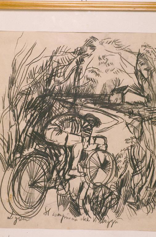 - NOTIZIE STORICO CRITICHE Protagonista del disegno è la bicicletta, emblematica della pittura di Zigaina degli anni '50. \nEssa viene scelta come soggetto perchè da subito intuita sia come "oggetto d'amore" (la bicicletta del padre, la compagna del girovagare dell'artista) sia come elemento ricco di interesse sul piano formale. Solo successivamente si carica anche di significato ideologico, in quanto emblema della realtà contadina e insieme dello slancio utopistico (Zigaina 1990). Sul significato simbolico della bicicletta nella pittura di Zigaina si veda anche Strukelj 1990.\nNei lavori ad essa dedicati, realizzati soprattutto intorno al 1950, normalmente la bicicletta compare o come oggetto isolato, spesso accostata alle falci fienaie, oppure insieme alle figure dei braccianti friulani, dei quali era il principale se non l'unico mezzo di locomozione. \nSingolare è dunque per Zigaina il tema "sportivo" di questo disegno, intitolato "Il campione del villaggio". L'artista stesso lo conferma, ricordando che si tratta di un foglio realizzato quasi per gioco apposta per l'amico Davide Lajolo, del quale voleva essere il ritratto scherzoso.\nL'iscrizione sul retro con la raccomandazione di restituire il foglio - firmata "Ulisse" come di consuetudine per Lajolo giornalista - fa pensare che essa potesse rivolgersi a chi doveva occuparsi della stampa del disegno sulle pagine dell' "Unità", di cui in quegli anni Lajolo era direttore.