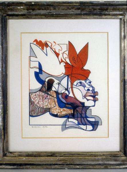 - NOTIZIE STORICO CRITICHE La produzione grafica dell'artista gode di una sua autonomia rispetto a quella scultorea e riveste un ruolo tutt'altro che marginale all'interno dell'attività di Bodini. Egli infatti si è molto dedicato alla realizzazione di incisioni, per la prima volta raccolte e pubblicate in un volume nel 1973 (Fabiani, 1973). \nQuesto disegno viene pubblicato come copertina di "Giorni - Vie Nuove" ( 31 dicembre 1975), il settimanale diretto da Davide Lajolo dal giugno 1969 al luglio 1978 (Giorni Vie, 1975). La frase che accompagna il disegno in copertina presenta il calendario dell'anno nuovo, che "Giorni" d'abitudine regala ai suoi lettori, illustrato da alcuni lavori degli artisti che la rivista sostiene. L'opera di Bodini, infatti, faceva da illustrazione a uno dei mesi dell'anno 1976, forse disegnata apposta per l'occasione. L' ingresso del foglio all'interno della collezione di Angela Candiani risale dunque con ogni probabilità ad un periodo di poco successivo al suo utilizzo in redazione. \nLa stessa iconografia, con alcune varianti, ricompare qualche anno dopo tra le stampe della cartella "Veder l'erba dalla parte delle radici" (XIV/XX, Bodini/ Lajolo, 1978), che raccoglie tre litografie realizzate da Floriano Bodini sullo spunto di tre frammenti dell'omonimo romanzo di Davide Lajolo. \nLa versione raccolta in quella cartella si distingue dal disegno della collezione, oltre che nei colori, anche per l'aggiunta di elementi nella parte destra del foglio: un piede-scultura e, in alto, la raffigurazione delle diverse fasi del volo di una colomba, vista di fianco e vista dall'alto. \nPer il significato della colomba nell'opera di Bodini si vedano le schede NSK 50 e 56.